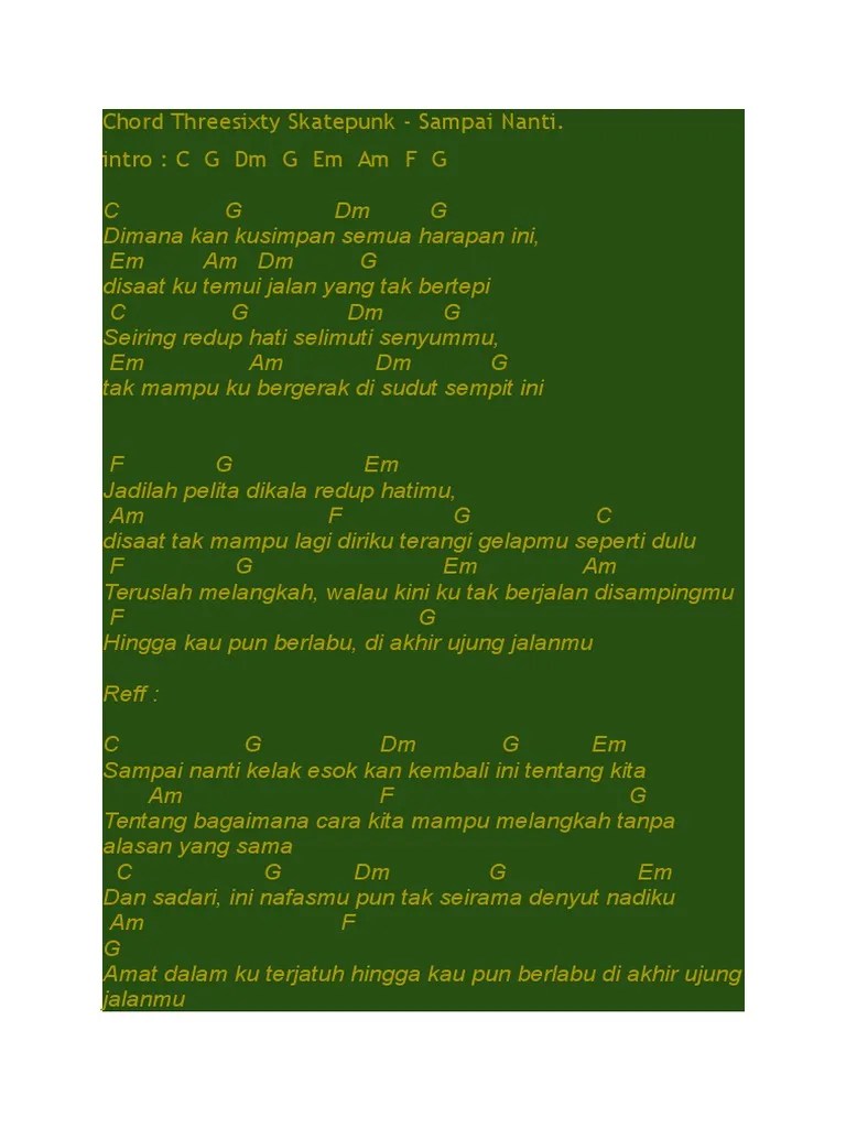 Kunci gitar dimainkan dari c. Penuhkanlah bejanaku dengan air sungaimu. Ingin rasanya aku selalu bersamamu. Jika ada kesalahan pada chord atau nada harap maklum ya! C f di mana kan ku simpan dm g.semua harapan ini em am di saat ku temui f g jalan yang tak bertepi c f seiring redup hati dm g.selimuti senyummu em am tak mampu ku bergerak f g di sudut sempit ini.